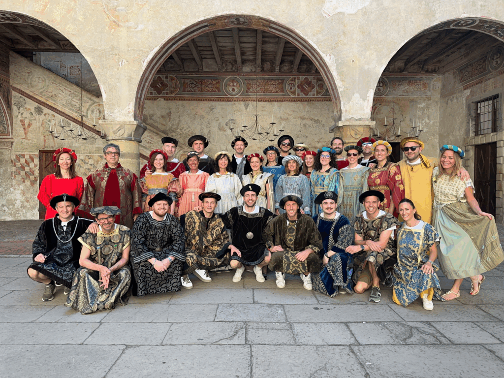 Vestiti con bellissimi abiti d’epoca confezionati a mano (e igienizzati con ozono) affronterete un viaggio nelle Sale del Castello per immergervi completamente nella vera vita di una corte medioevale.