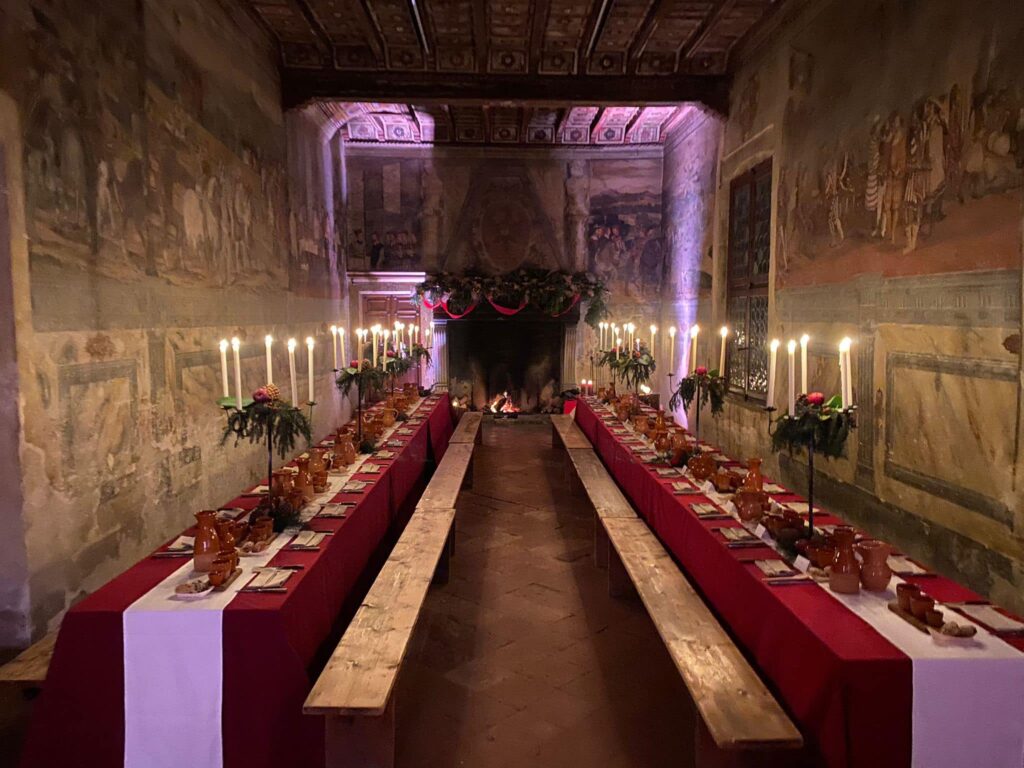 Il grande camino quattrocentesco ancora perfettamente funzionante riscalderà l’atmosfera e il castello sarà allestito con una suggestiva veste natalizia.